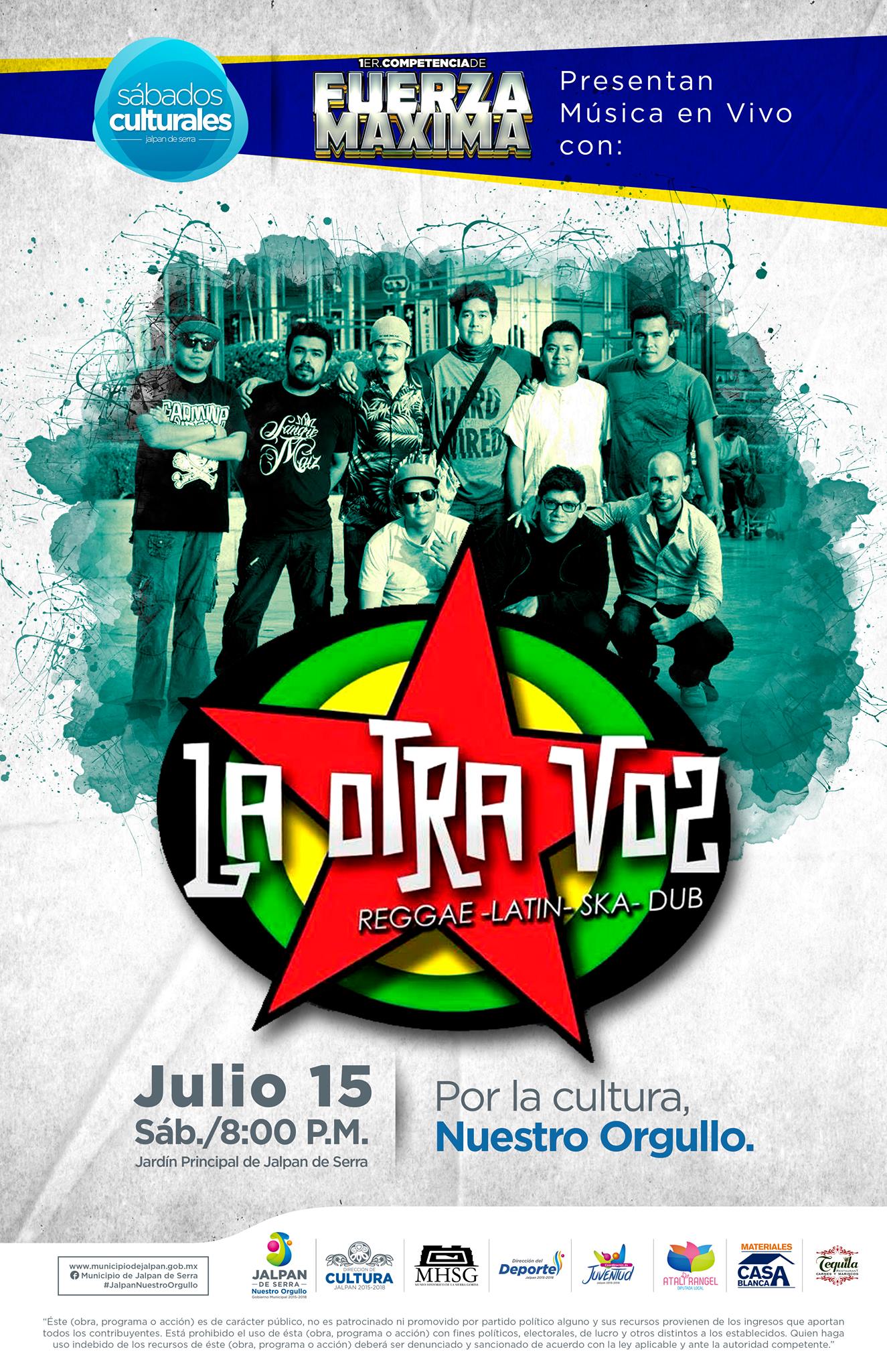 El grupo queretano “La Otra Voz” se presentará el 15 de julio en el municipio de Jalpan durante el evento “Sábado Cultural” en punto de las 20:00 horas, en el jardín principal del centro donde a la par se realizará la primer competencia de “Fuerza Máxima”.