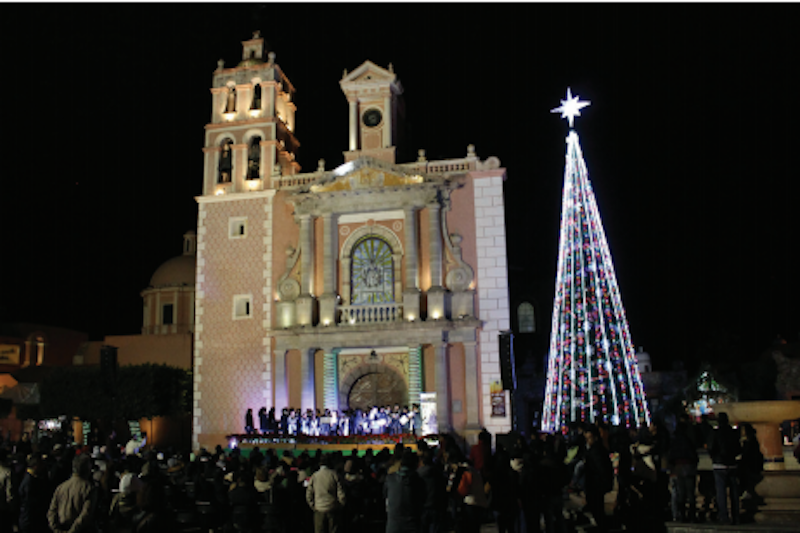 El alcalde Raúl Orihuela González, realizó el tradicional encendido del mega Árbol Navideño que se colocó en el Jardín Miguel Hidalgo, en Tequisquiapan, con motivo de las festividades navideñas.