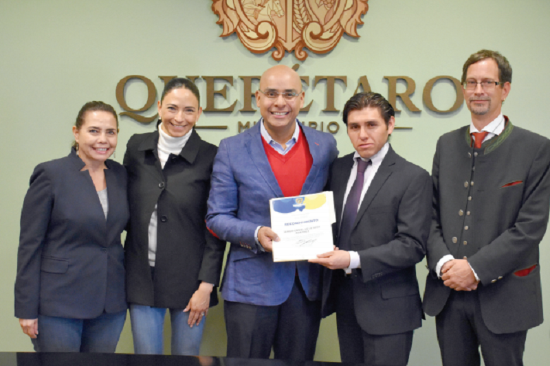 El presidente Municipal de Querétaro, Marcos Aguilar Vega, entregó un reconocimiento al artista queretano Sergio Daniel de la Vega Martínez, por haber ganado una beca del Programa Artist in Residence, que le permitirá realizar una estancia de tres meses en la ciudad de Viena, en Austria.
