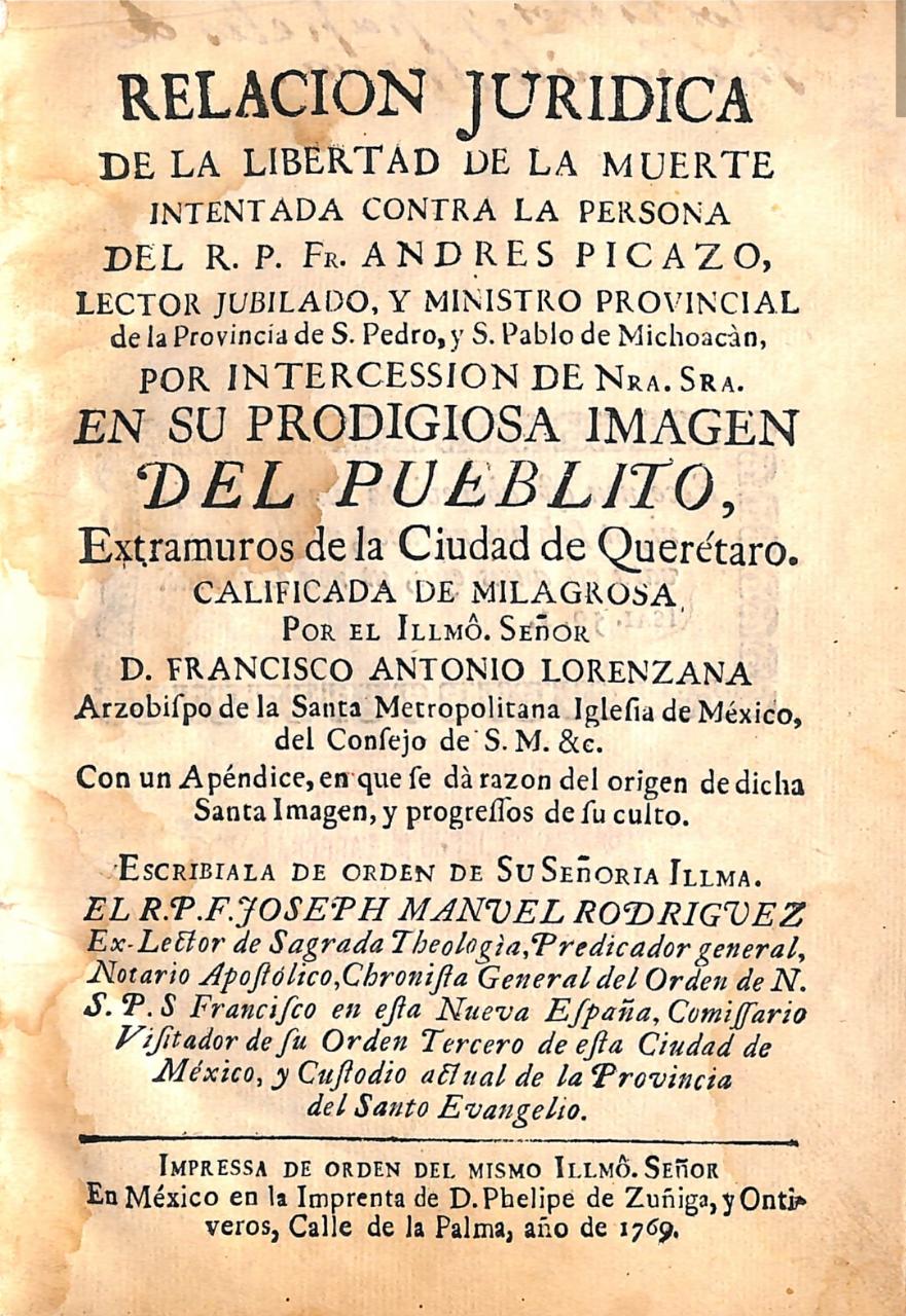 El fenómeno al que se refiere en esa época fue la supervivencia del fraile Andrés Picazo a un atentado en su contra. Todo el evento, el ataque y su convalecencia, el peritaje del milagro y la declaratoria oficial está descrito en el libro: Relación jurídica de la libertad de la muerte intentada contra la persona del R. P. Fr. Andrés Picazo, lector jubilado, y ministro provincial de la Provincia de S. Pedro, y S. Pablo de Michoacán, por intercesión de Nra. Sra. de su prodigiosa imagen del Pueblito (sic)… (1769), obra escrita por Joseph Manuel Rodríguez en el mismo año de los acontecimientos.