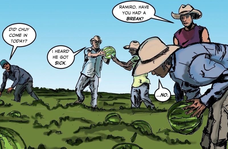 En el cómic de Rodríguez, que se publicó en internet esta semana, los trabajadores temen que la ausencia de un compañero se deba a que lo hayan deportado o que se haya infectado con COVID-19. Cuando los voluntarios van a entregar mascarillas, los trabajadores temen que puedan ser oficiales de inmigración que vienen a detenerlos.
