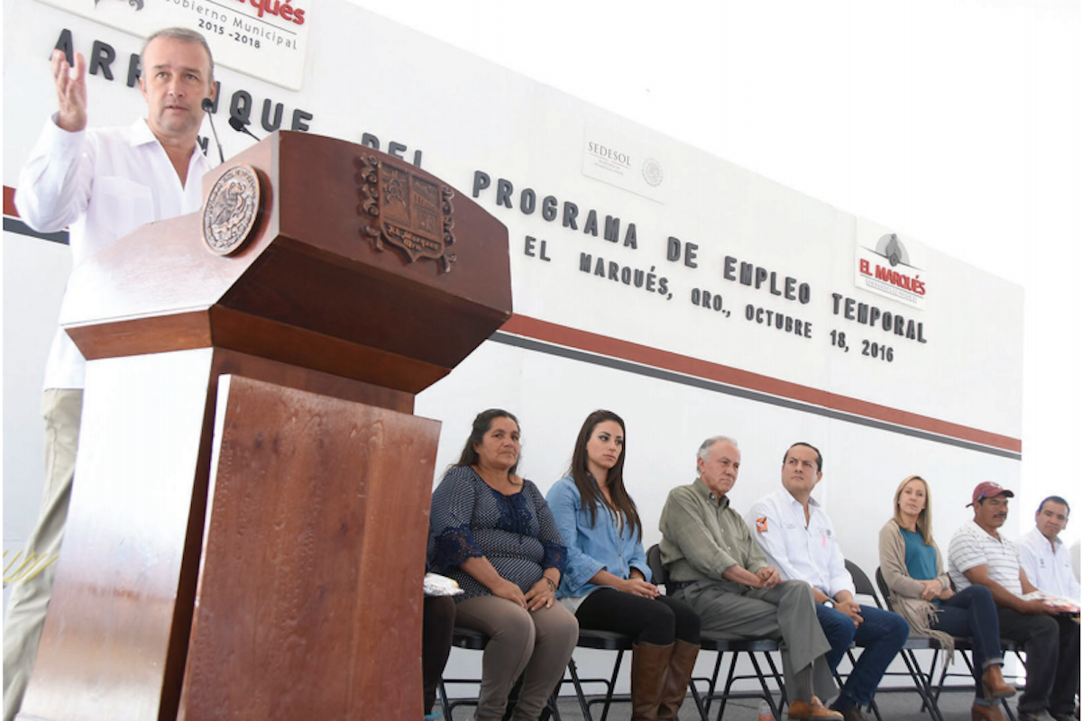 El Presidente Municipal en El Marqués, Mario Calzada Mercado, acompañado por su esposa, la Presidenta del Sistema Municipal DIF, Lorena Regalado de Calzada y el Delegado Federal de la Sedesol, Ernesto Luque Hudson, arrancó el Programa de Empleo Temporal en San Isidro Miranda, a través del que obtendrán trabajo 81 personas.