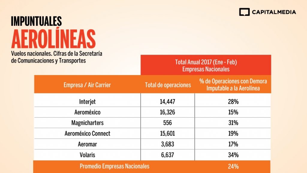 De acuerdo a cifras de la Secretaría de Comunicaciones y Transportes (SCT) las aerolíneas más impuntuales en vuelos nacionales son Volaris, Interjet y Magnicharters.