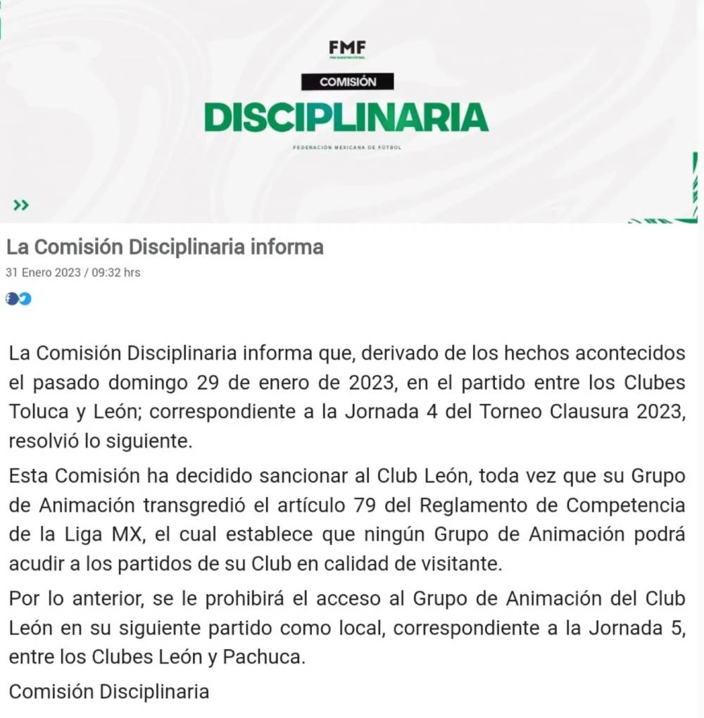 “Por lo anterior, se le prohibirá el acceso al Grupo de Animación del Club León en su siguiente partido como local, correspondiente a la Jornada 5, entre los Clubes León y Pachuca”, señala el comunicado.