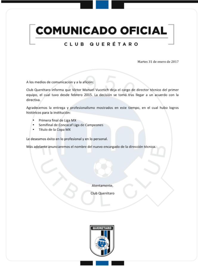 Los Gallos de Querétaro le dieron las gracias al técnico que les dio su primer trofeo oficial en su corta historia profesional, nos referimos a Victor Manuel Vucetich, que hoy se convirtió en el segundo técnico cesado del Clausura 2017.