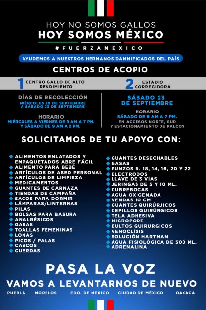 Los Gallos Blancos de Querétaro abrieron dos centros de acopio para los damnificados que dejó el fuerte sismo de 7.1 grados este martes, los cuales se encuentran en el Centro Gallo de Alto Rendimiento y en el Estadio Corregidora.