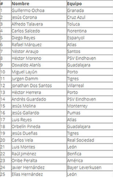 Los jugadores que no fueron convocados por lesión o por compromisos con sus clubes, destaca el caso de el ‘Tecatito’ Corona, Giovanni Dos Santos, Marco Fabián que recién reapareció en las canchas con el Eintracht y el lesionado Hirving Lozano, delantero del Pachuca.