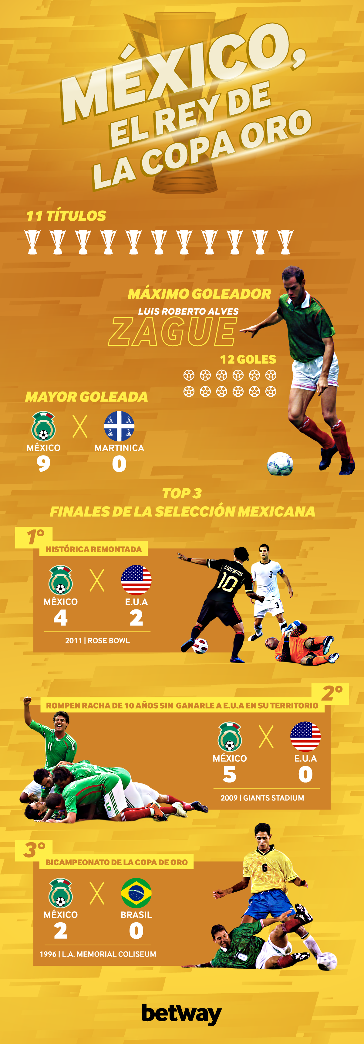 México cuenta con 11 Copas de Oro por lo que se ha ganado el nombre del Rey de esta competición. Además, ha vivido emblemáticas finales como la que tuvo en 2011 con Estados Unidos en la que ganaron 4-2 con goles de Pablo Barrera, Andrés Guardado, Pablo Barrera y Giovani dos Santos.