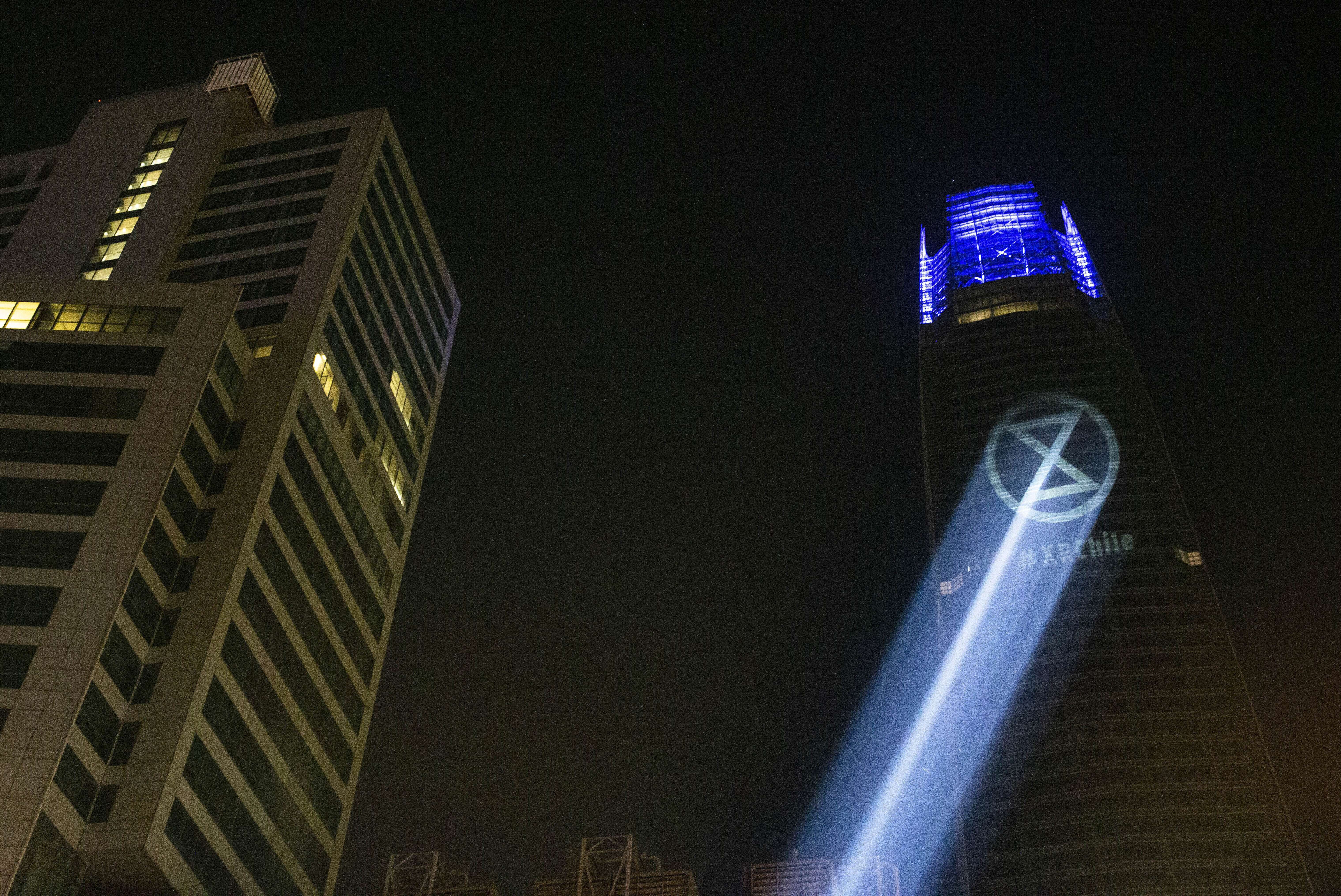 Una treintena de manifestantes se congregaron en una de las esquinas del edificio Costanera Center, de 300 metros (980 pies) de altura, y bloquearon una avenida al tiempo que aprovechaban la oscuridad de la noche para proyectar el logo de XR, un reloj de arena invertido que simboliza que el tiempo para revertir el cambio climático mundial se está agotando.