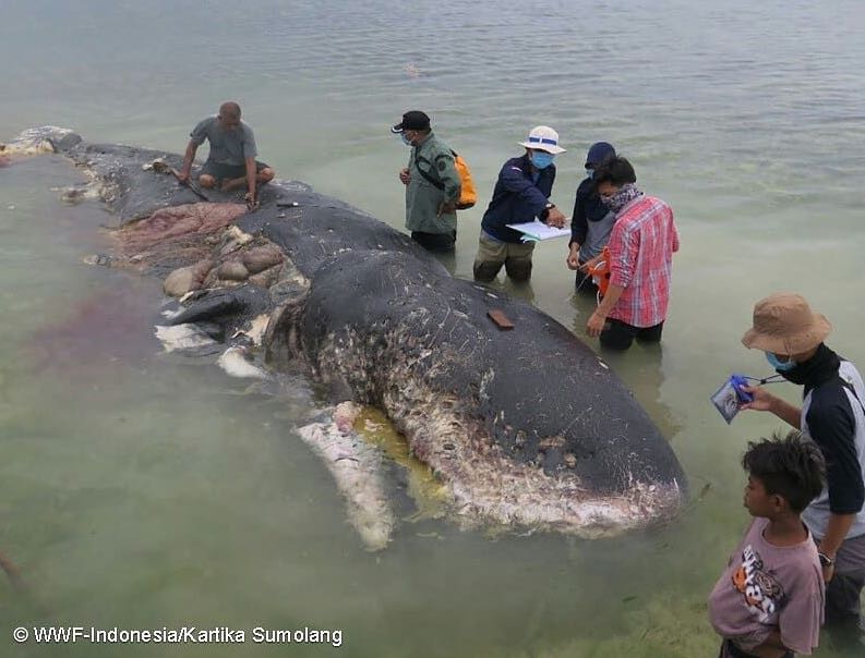 El equipo de Wakatobi, asistido por investigadores de la Academia de la Comunidad de Marina y Pesca, del Fondo Mundial para la Vida Silvestre (WWF) y lugareños, abrieron el estómago del animal y encontraron 5.9 kilogramos de residuos plásticos.