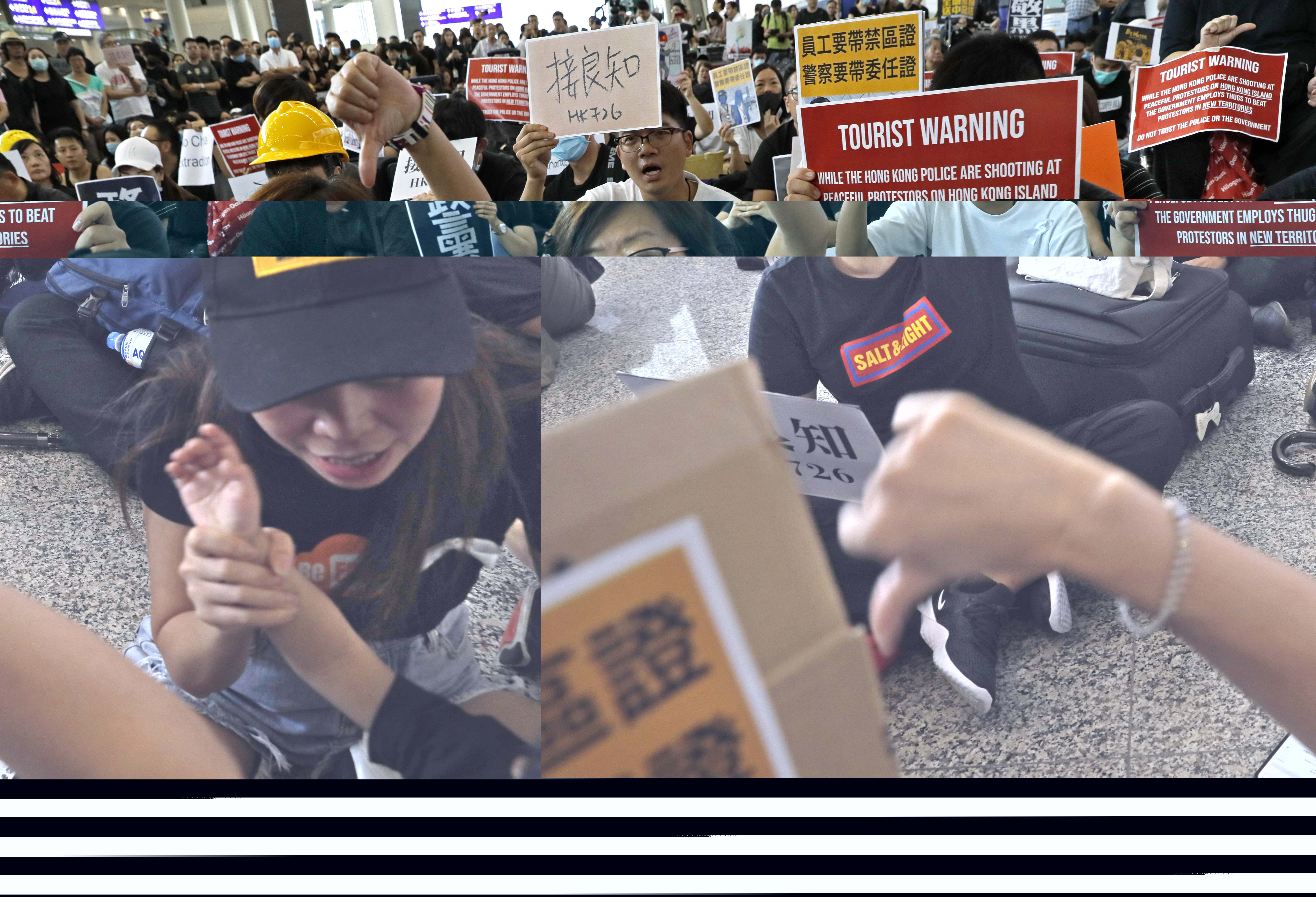 Más de 1.000 personas vestidas de negro llenaron la sala de llegadas del Aeropuerto Internacional de Hong Kong, donde recibieron a los visitantes internacionales con cánticos de “¡No hay disturbios, solo tiranía!”.