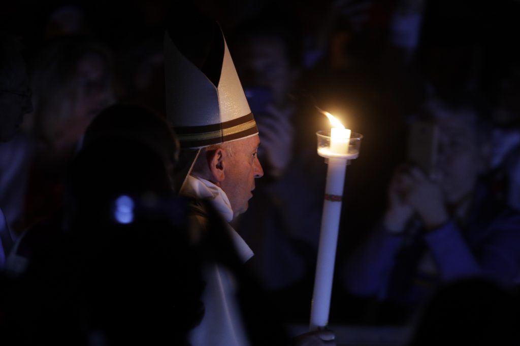 Al inicio de la ceremonia en vísperas de la Pascua, Francisco se desplazó lentamente vestido de blanco con una vela encendida por el pasillo oscurecido de la Basílica de San Pedro. Al cántico en latín de “luz de Cristo”, la iluminación se encendió dramáticamente en la basílica conforme a la tradición.