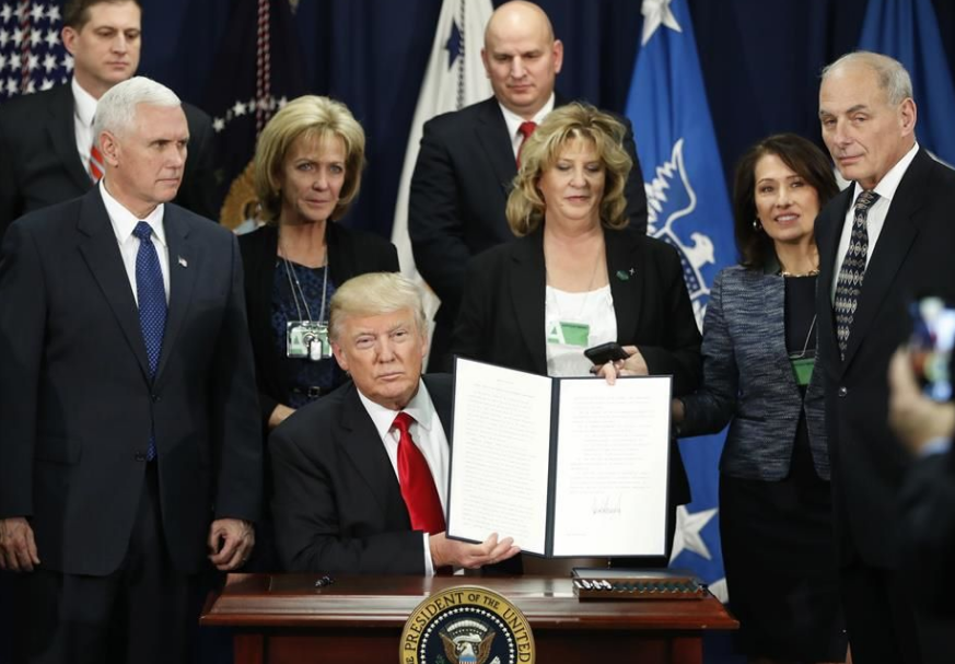 El presidente de Estados Unidos, Donald Trump, firmó hoy dos órdenes ejecutivas decretando la construcción de un muro en la frontera con México, la ampliación de la capacidad de centros de detención para indocumentados y priorizar la deportación de inmigrantes indocumentados convictos por crímenes.
