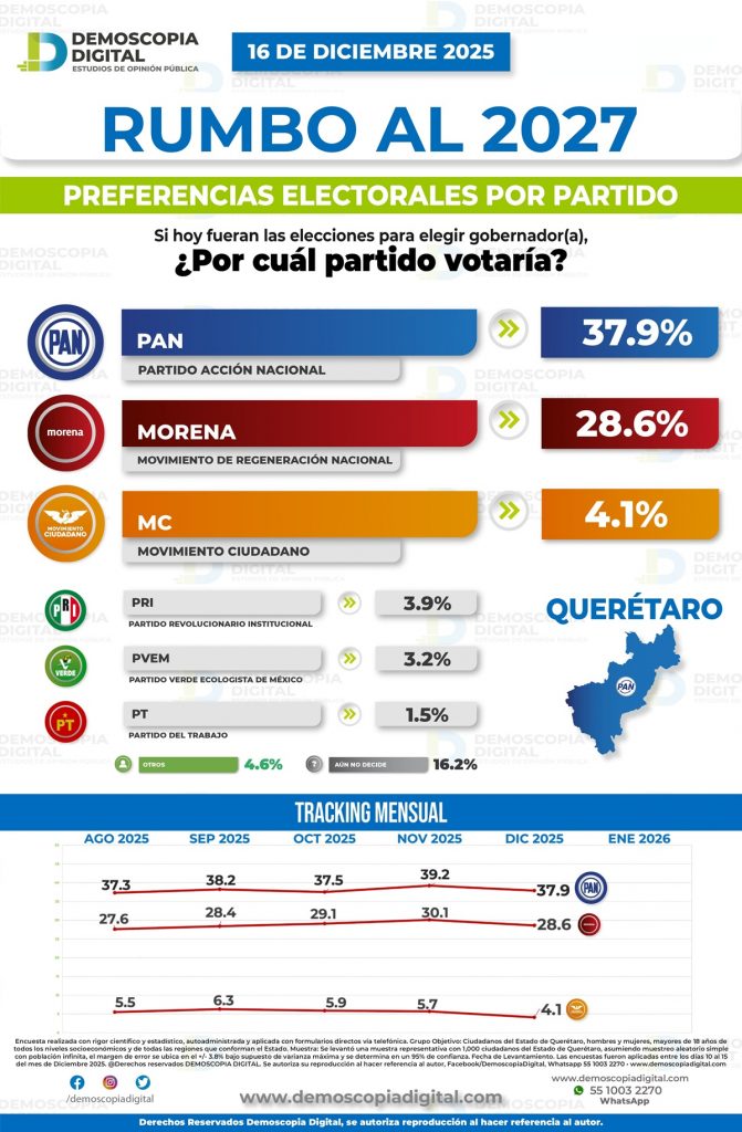En la encuesta publicada por la casa Demoscopia Digital, la cual mide las preferencias electorales rumbo a la elección de gobernador de Querétaro, se puede ver que Acción Nacional gana en preferencias con un 37.9%, seguido de Morena con un 28.6% y Movimiento Ciudadano con 4.1%.