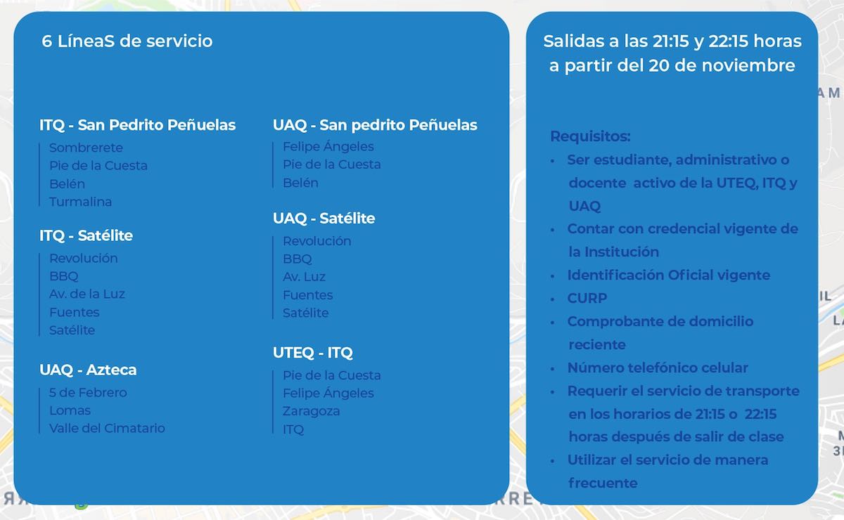 Arrancó con seis líneas de servicio, aunque se espera que la segunda etapa del programa de Transporte Universitario gratuito comience en enero y cubra UAQ Campus Juriquilla, Campus Aeropuerto UAQ, la Escuela Normal del Estado Qro. y otras universidades públicas.