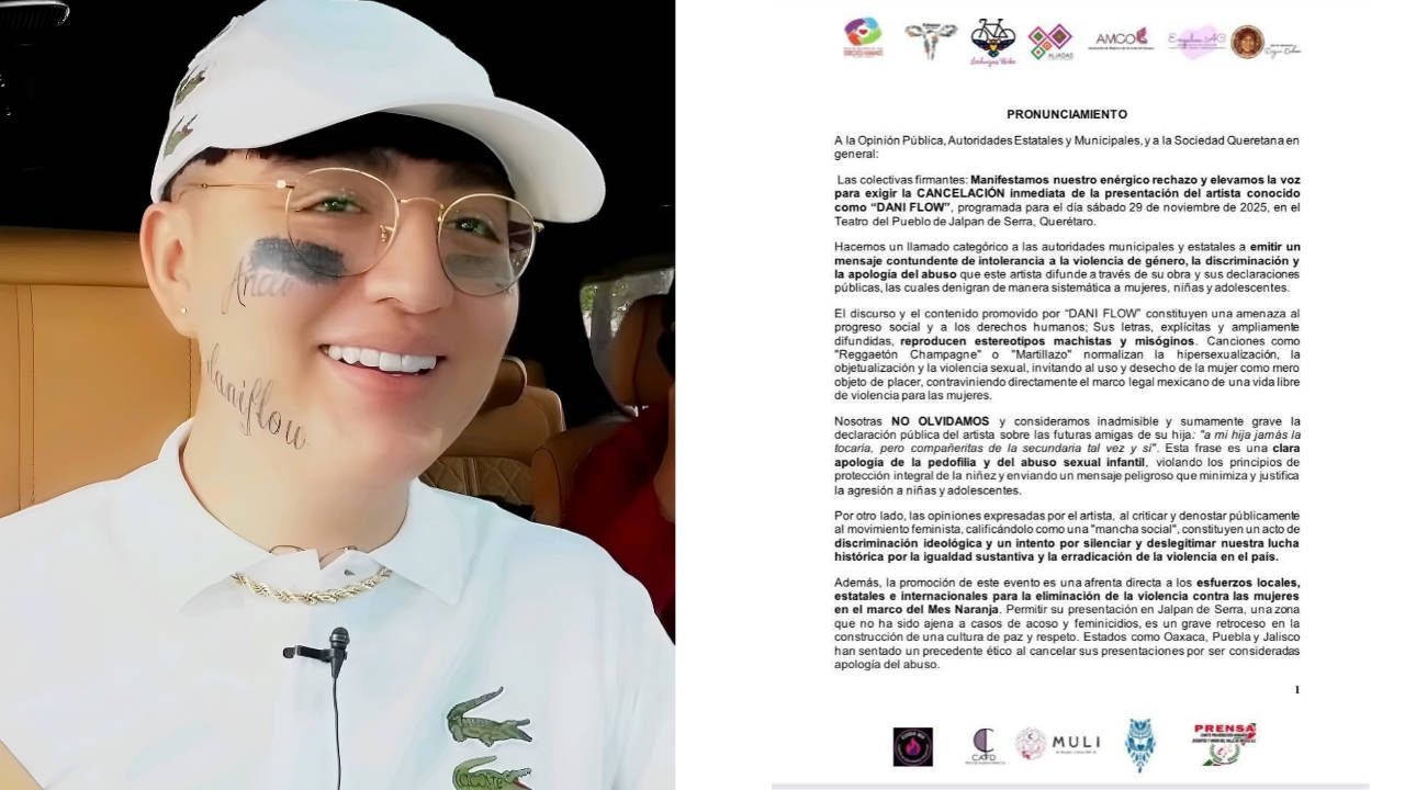 Diversas colectivas feministas de Querétaro emitieron un pronunciamiento en el que exigieron la cancelación inmediata del concierto del artista Dani Flow, programado para el 29 de noviembre en el Teatro del Pueblo de Jalpan de Serra.