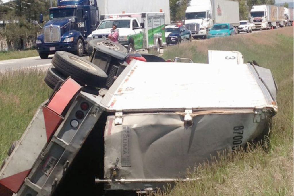 Posteriormente, otro chofer con un trailer circulaba metros atrás, donde chocó por alcance contra la caja y terminó volcada la pesada unidad, sobre el camellón central.