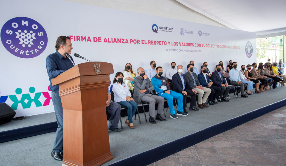 “Querétaro se distingue en el mundo por su trabajo, sus valores y su talento”, aseguró el gobernador del estado, Mauricio Kuri González durante la firma de la Alianza por el Respeto y los Valores con el colectivo “Somos Querétaro”, convenio colaborativo que tiene por objetivo implementar un programa de concientización y formación de ciudadanía, a través de la difusión de la importancia de la no violencia, la tolerancia y los derechos humanos.