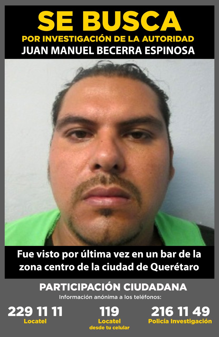 La Fiscalía General del Estado de Querétaro distribuye la foto de Juan Manuel Becerra Espinosa, quien es el presunto responsable de la muerte de un cliente del centro nocturno llamado Dash, ubicado sobre Av. Constituyentes, en la esquina de la calle Vicente Guerrero.