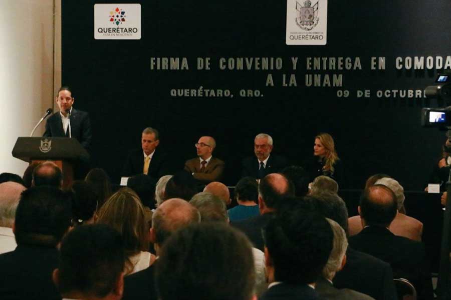 Luego de firmar el convenio, junto con el gobernador del estado de Querétaro, Francisco Domínguez Servién, por el cual esta casa de estudios recibió en comodato el inmueble que albergará a dicho centro, el rector Graue destacó que “de esta manera vamos a impactar con mayor solidez a la población local que disfruta del centro de esta ciudad”.