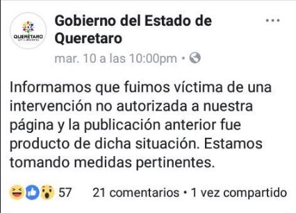 En menos de media hora, gobierno del estado publicó un mensaje aclaratorio “Informamos que fuimos víctima de una intervención no autorizada a nuestra página y la publicación anterior fue producto de dicha situación. Estamos tomando medidas pertinentes”.