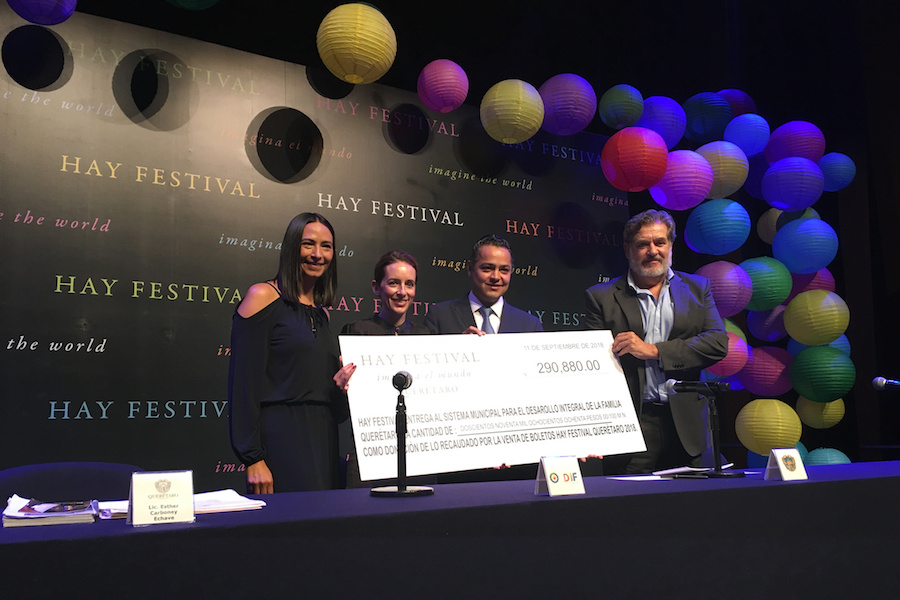 Durante la rueda de prensa, el representante del Hay Festival hizo entrega de un donativo por 290 mil 880 pesos al sistema Municipal para el Desarrollo Integral de la Familia (DIF), recursos que serán utilizados para la creación de un eespacio didáctico en el Centro de Día Nhjoya.
