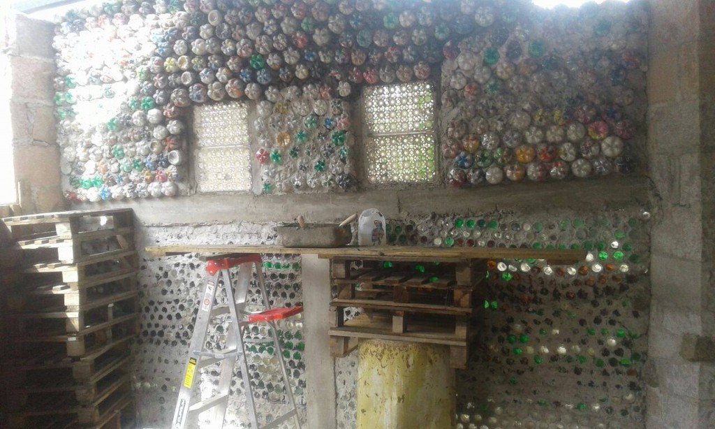 Para el Centro Comunitario, que tiene una área de 244.7 m2, se utilizaron ecoladrillos (botellas de PET de 2 litros rellenas de desechos plásticos, como bolsas y empaques), botellas de vidrio de 355 ml, pallets de madera y tabique rojo, todo reforzado con mezcla de cemento. El material reciclado utilizado para esta construcción equivale a más de 450 kilos de desechos plásticos.