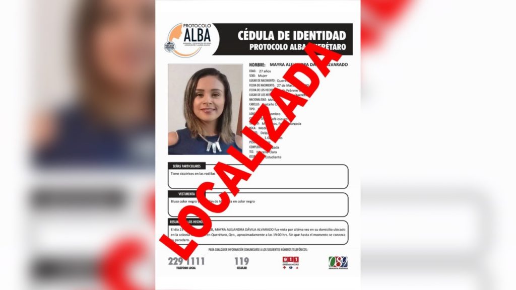 La Fiscalía General de Justicia (FGJ) de Querétaro dio por cancelada la difusión de la Cédula de Identidad del Protocolo ALBA, para la búsqueda de la joven Mayra Alejandra Dávila Alvarado, quien ya fue localizada.