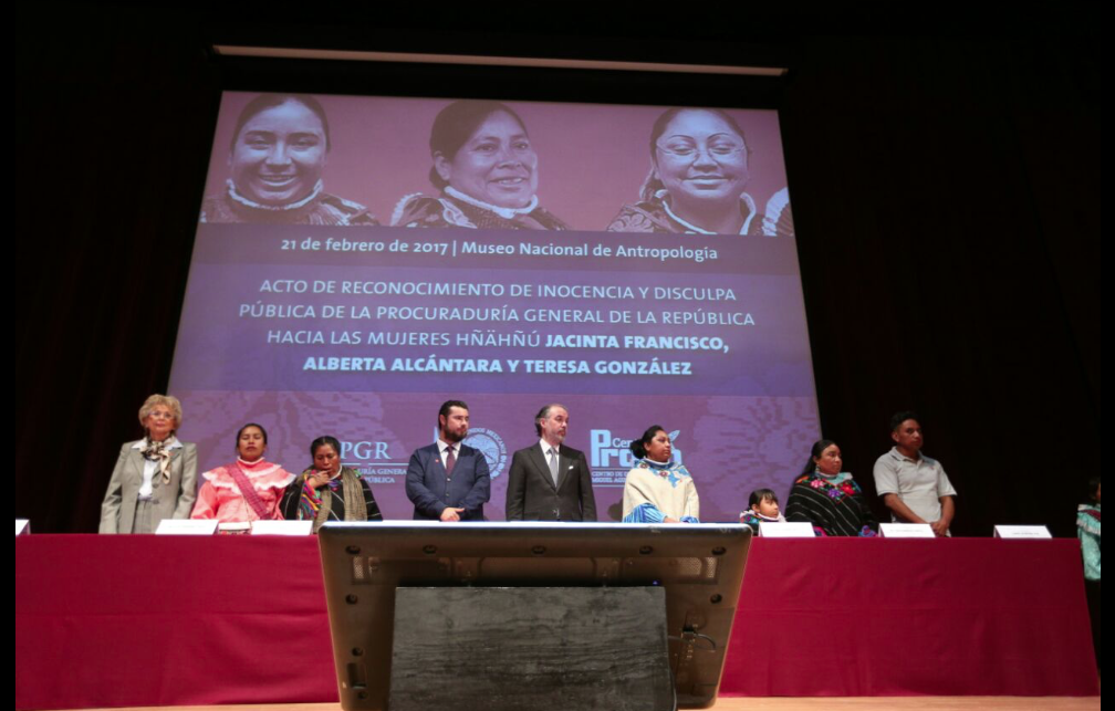 El titular de la PGR, Raúl Cervantes Andrade, encabezó este martes el reconocimiento de inocencia y disculpa pública hacia las mujeres indígenas de la etnia hñáhñú Jacinta Francisco, Alberta Alcántara y Teresa González, quienes fueron detenidas y sentenciadas por el delito de secuestro.