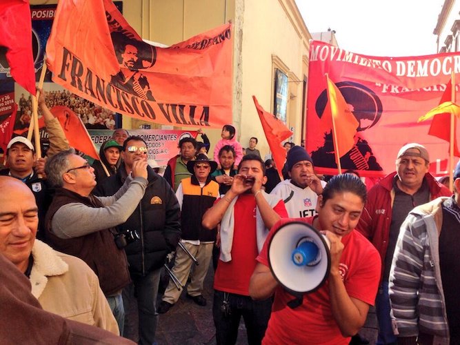 Al rededor de 200 personas del Movimiento Democrático Queretano Francisco Villa se conglomeraron en Plaza de Armas para solicitar la intervención del Gobierno del Estado en la reintalacion de 48 comerciantes que fueron desalojados de la Alameda Hidalgo desde hace un año cuatro meses.