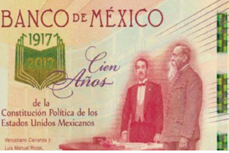 Agustín Carstens describió que el billete de 100 pesos lleva en el anverso, como motivo principal, una viñeta en la que aparecen Venustiano Carranza y Luis Manuel Rojas; como fondo muestra trazos del Teatro de la República y en la parte izquierda la Constitución con los numerales 1917 y 2017; en la marca de agua se ve el águila mexicana que ilustró la portada de la Carta Magna original.