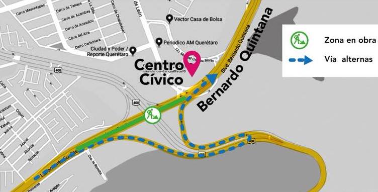 Autoridades recomiendan a quienes transitan desde el libramiento Sur Poniente, desviarse en la incorporación a la carretera estatal 400 a Huimilpan, tomar el retorno para volver a incorporarse al Boulevard Bernardo Quintana.