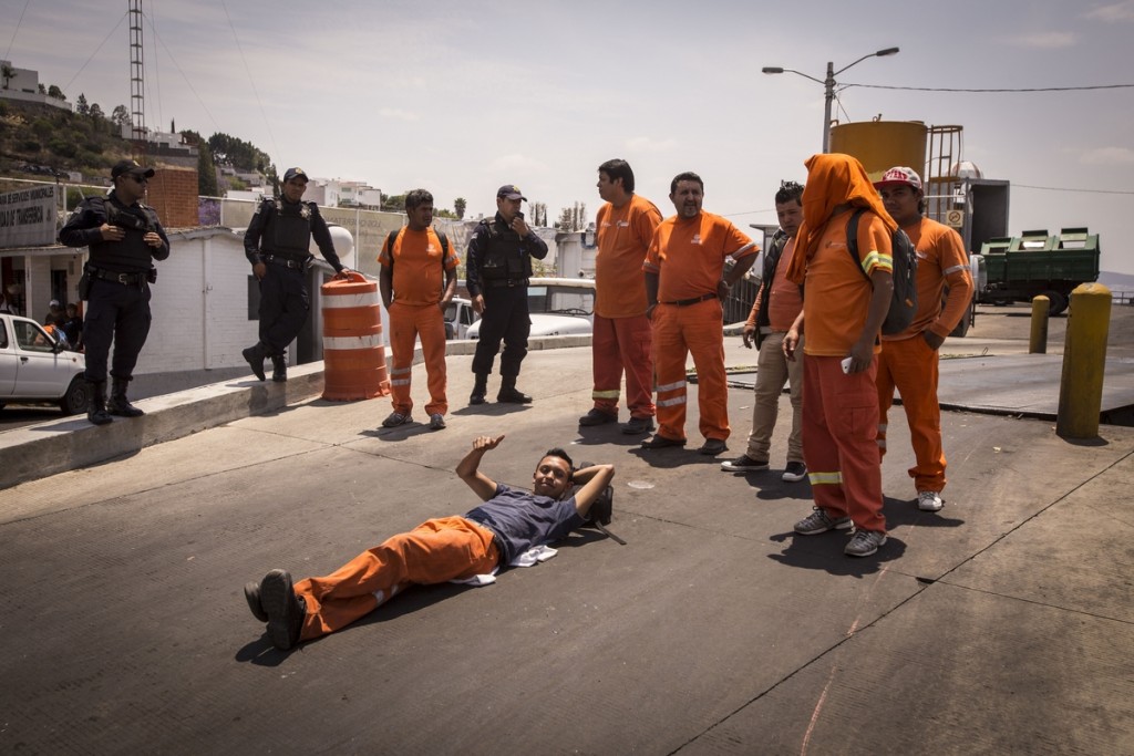 Querétaro, Querétaro. 10 de abril de 2016.- Después de la advertencia del uso de la fuerza pública por parte del secretario de administración, Manuel Velázquez Pegueros; los trabajadores de recolección de basura fueron forzados a dejar salir los camiones de recolección que habían sido retenidos la madrugada de este domingo, como parte de un paro de labores debido a la incertidumbre laboral tras la concesión del servicio de recolección por parte del municipio al empresa Red Recolectora S.A. de C.V.