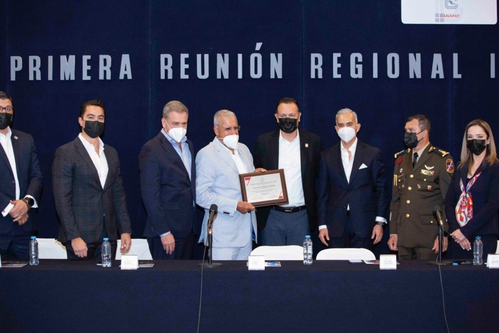 El mandatario estatal, acompañado por representantes de la Cámara, entregó un reconocimiento a Rafael Herrera Fernández, director general del Grupo Flecha Amarilla y consejero vitalicio de la CANAPAT, de quien celebró su historia en el sector empresarial.