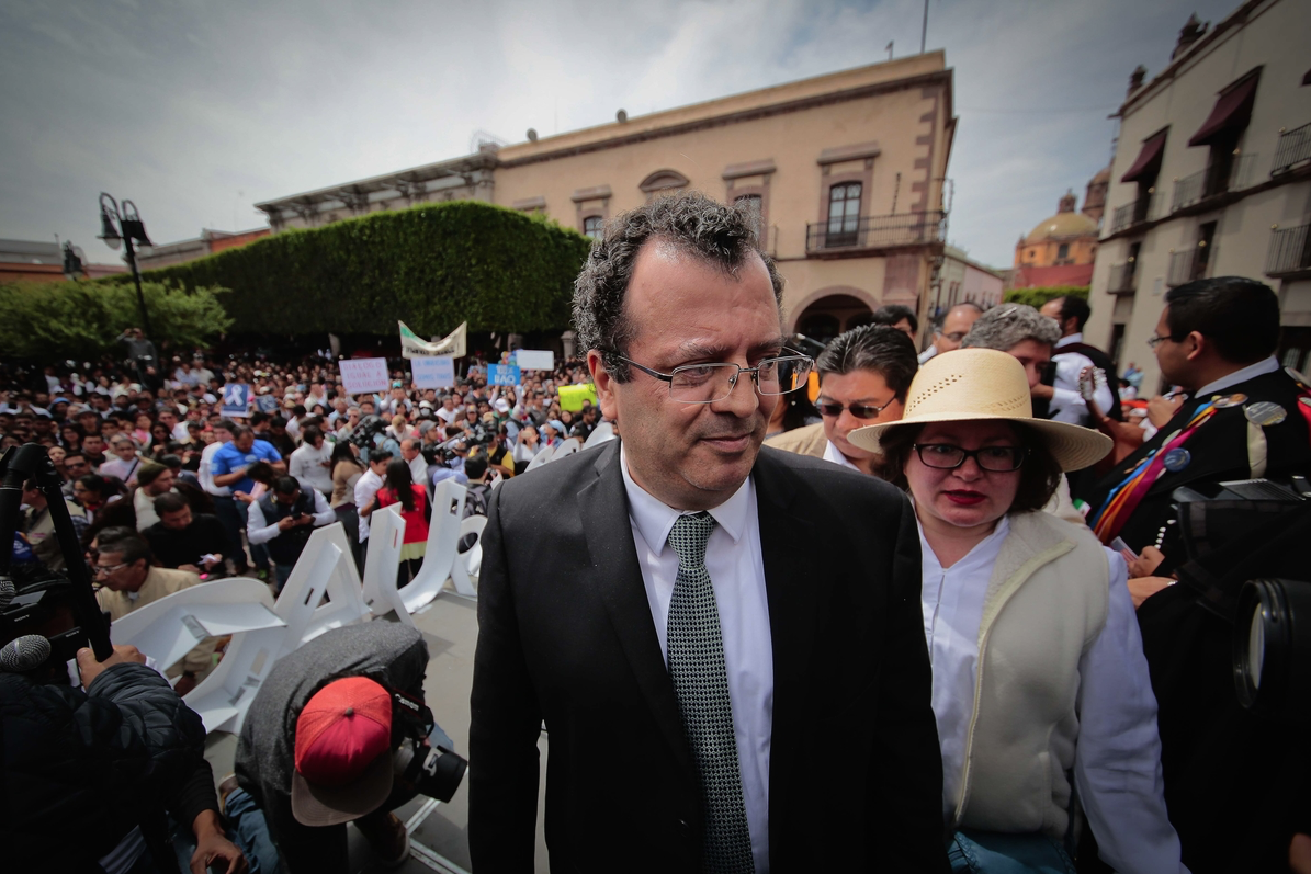 Desde las 7 de la mañana personal de la universidad instalaba el templete, el sonido, la gran pantalla y echaba andar la planta de luz portátil. Los guardias de seguridad de la UAQ, se dejaban ver con chamarra azul que aludía al equipo de seguridad. La cita era a las 11:00 horas, del día 21, frío y nublado; día “feriado”, de tal suerte que pocos eran los que habían llegado a la cita a la hora pactada. Eran más los curiosos y los “orejas” que los convocados. Las puertas de gobierno cerradas. Poco a poco fue calentando la mañana y los invitados iban llegando por los cuatro polos de la Plaza.