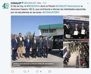 La Secretaría de la Defensa Nacional (Sedena) donó una aeronave tipo CESSNA 182-S al Colegio Nacional de Educación Profesional Técnica (Conalep) en Querétaro, plantel Aeronáutico.