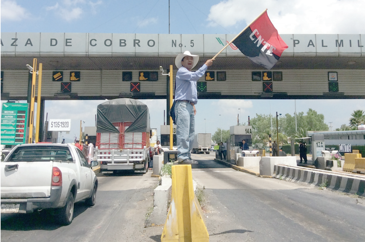 Alrededor de 100 docentes integrantes de la Coordinadora Nacional de Trabajadores de la Educación (CNTE) permanecieron por casi dos horas en la caseta Palmillas, sobre la México-Querétaro, en donde entregaron panfletos a los automovilistas y permitieron el paso libre de los vehículos.