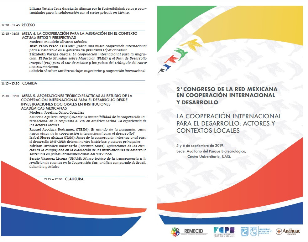 Las instituciones convocantes a este encuentro son la REMECID, la UAQ, a través de la Facultad de Ciencias Políticas y Sociales (FCPS) y la Universidad Anáhuac Querétaro, las cuales se aliaron para generar un espacio de difusión, debate y reflexión en que se abrirán mesas redondas con temas de cooperación internacional, paradiplomacia, migración, seguridad y desarrollo, conferencias magistrales y presentación de libros.