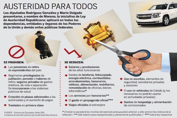 Aunque la presentación de la misma recuerda los discursos de principios del siglo pasado, “la conducción del proceso de transformación democrática cuyos cimientos estamos preparando, pasa por la limitación de la opulencia en el ejercicio del gasto público y corresponderá, una vez en funciones, al Presidente López Obrador, encabezar los esfuerzos para dignificar la función pública hacia cauces de austeridad y racionalidad, priorizando el bienestar colectivo”, busca reducir los costos del gobierno y sus funcionarios.