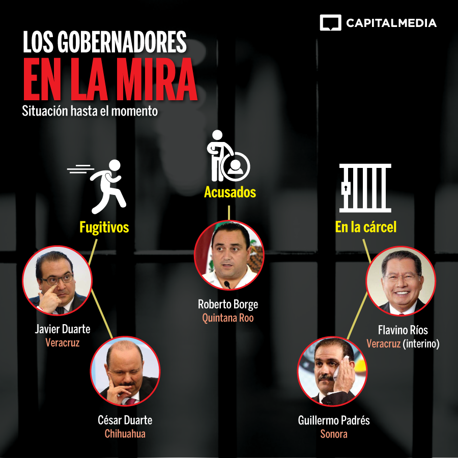 Javier Duarte, exgobernador de Veracruz, se encuentra prófugo de la justicia y la Procuraduría General de la República (PGR) ofrece una recompensa por información sobre su paradero. Está acusado de lavado de dinero y delincuencia organizada.