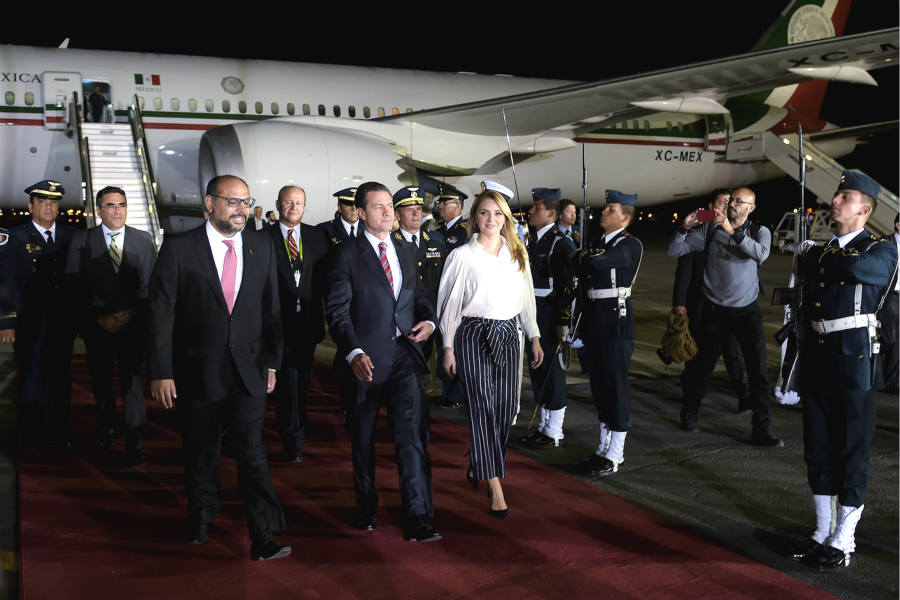 Peña Nieto viaja acompañado por su esposa, Angélica Rivera de Peña, y los secretarios de Economía, Ildefonso Guajardo Villarreal; de Relaciones Exteriores, Luis Videgaray Caso, y el vocero del gobierno federal, Eduardo Sánchez.