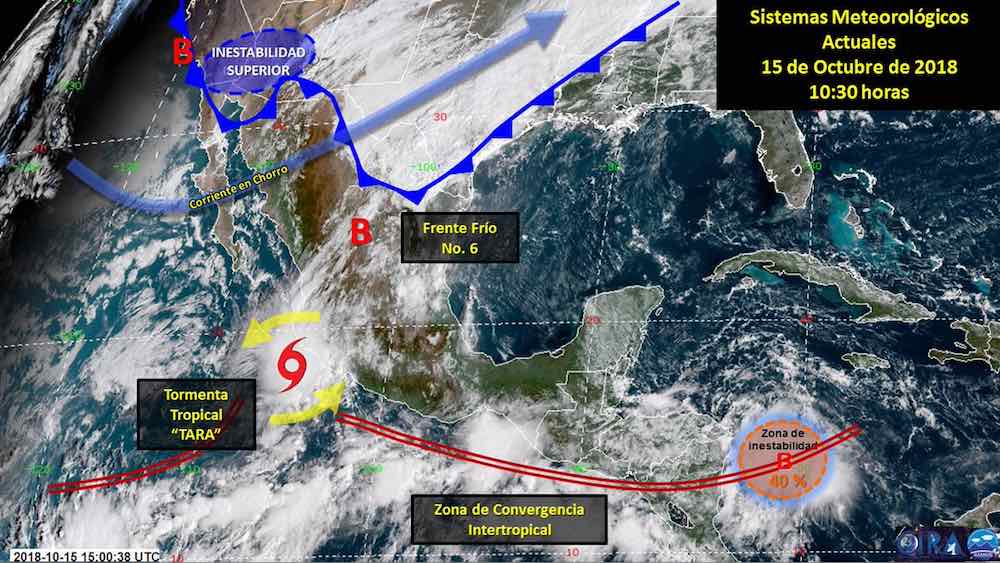 A las 09:00 de la mañana de este lunes la Depresión Tropical 22-E se intensificó y convirtió en la tormenta tropical Tara, la cual a las 07:00 horas se ubicaba a 125 kilómetros (km) al suroeste de Punta San Telmo, Michoacán, y a 155 kilómetros al sur de Manzanillo, Colima, con vientos de 75 kilómetros por hora (km/h), rachas de hasta 95 km/h y movimiento al oeste-noroeste a 2 km/h, informó el Servicio Meteorológico Nacional (SMN), dependiente de la Comisión Nacional del Agua (Conagua).