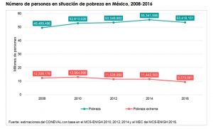 El número de pobres desde que es medido por el Consejo Nacional de Evaluación de la Política de Desarrollo Social (Coneval) pasó de 49.5 millones de mexicanos en 2008 a 53.4 millones en 2016. Es decir, en 8 años la pobreza aumentó en 3.9 millones de personas.