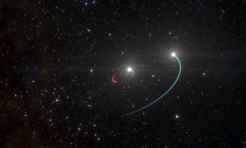 El agujero negro forma un par con una de las dos estrellas, que está tan cerca como la Tierra del Sol. La otra está mucho más lejos, orbitando al par, y gira tan rápidamente que está deformada y abultada en su ecuador.