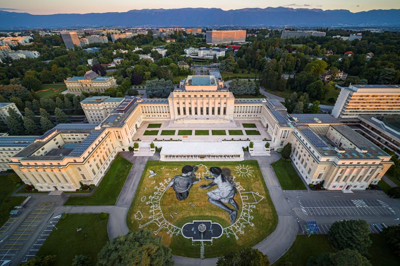 GINEBRA, 26 jun (Reuters) – Un artista francés pintó una obra de arte biodegradable de grandes dimensiones en el césped de la sede europea de Naciones Unidas en Ginebra, con motivo del 75 aniversario de su fundación el viernes.