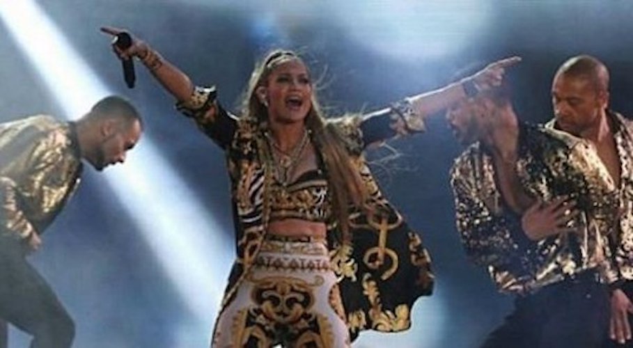El escandaloso atuendo, apenas lograba cubrir sus partes íntimas, aunque por seguridad, JLo llevaba debajo de este vestuario un enterizo en color piel.