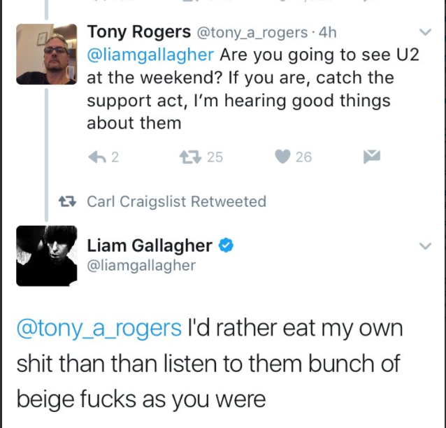 El ex vocalista de Oasis Liam Gallagher arremetió contra la banda U2 luego de que un tuitero le preguntara si asistiría al show de la agrupación irlandesa, a lo que el cantante respondió “prefiero comer mi propia mierda que ir a escucharlos”.