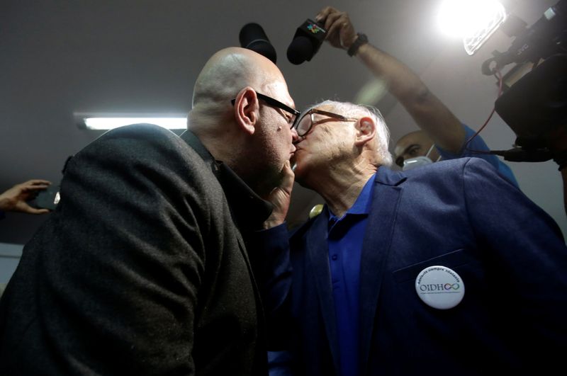 SAN JOSÉ (Reuters) – Una jueza, dos testigos y cientos de “invitados virtuales” acompañaron el martes al activista Marco Castillo y a Rodrigo Campos en su boda, en el primer día en que parejas del mismo sexo pudieron contraer matrimonio en Costa Rica.