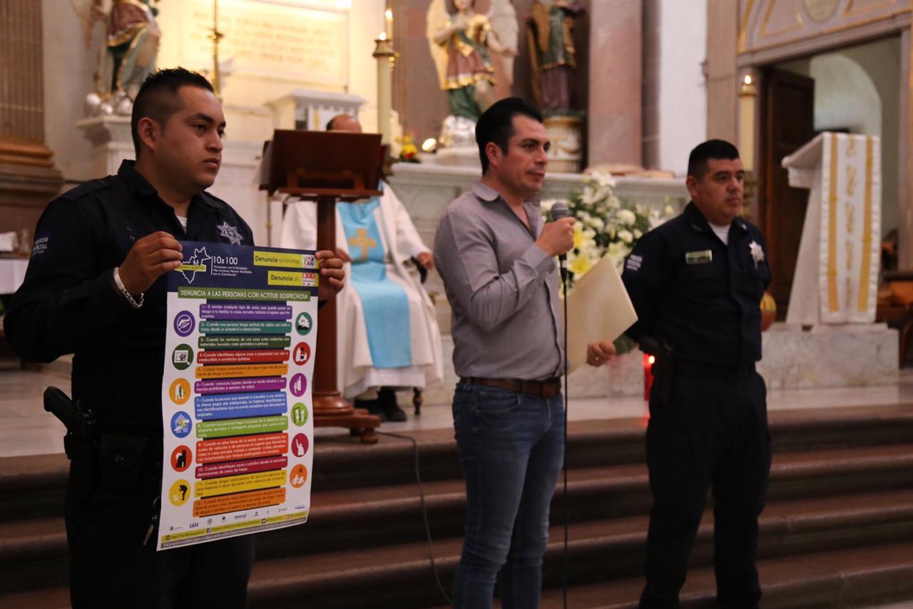 Feligreses de la iglesia de La Congregación en colonia Centro, se sumaron al programa 100×10 al conocer las 12 recomendaciones para reportar personas o situaciones sospechas a través del 911 o del 089.