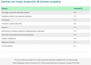 Las cifras muestran las profesiones con mayor número de personas jóvenes al cuatro trimestre de 2017, entre las carreras con mayor número de profesionistas son: